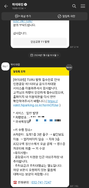 공항에서 차량을 맡기게 되면 또 한번 카톡을 받게 되는데요.
